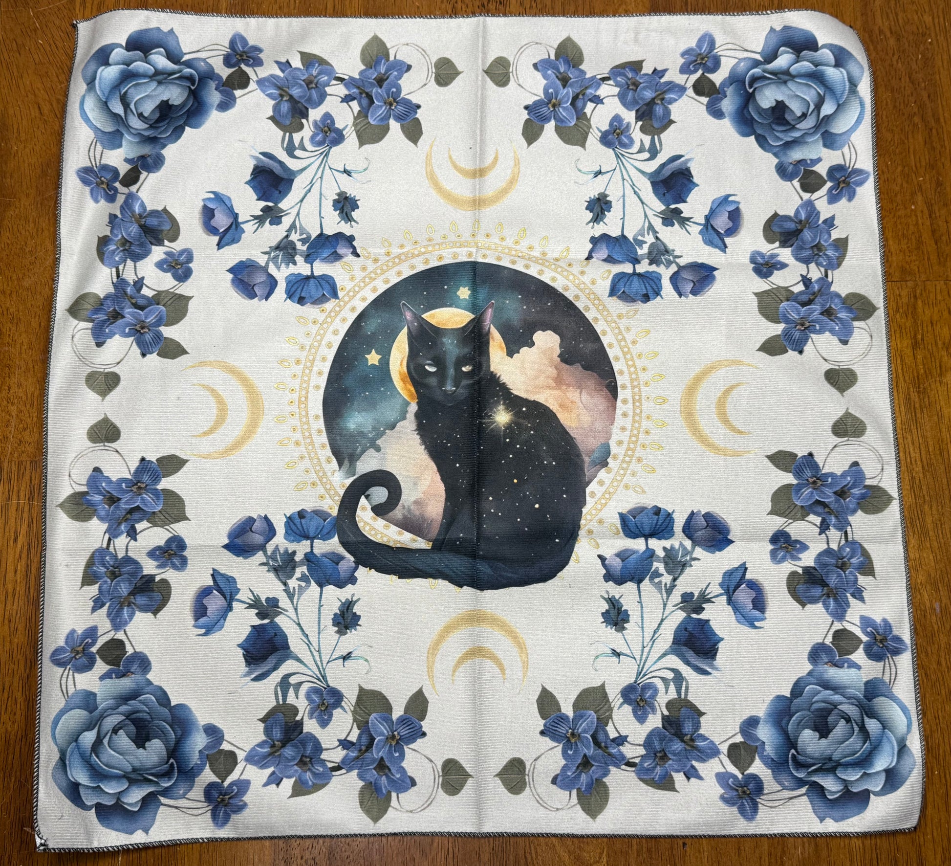 Altar Cloth - white with black mystical cat and blue flowers