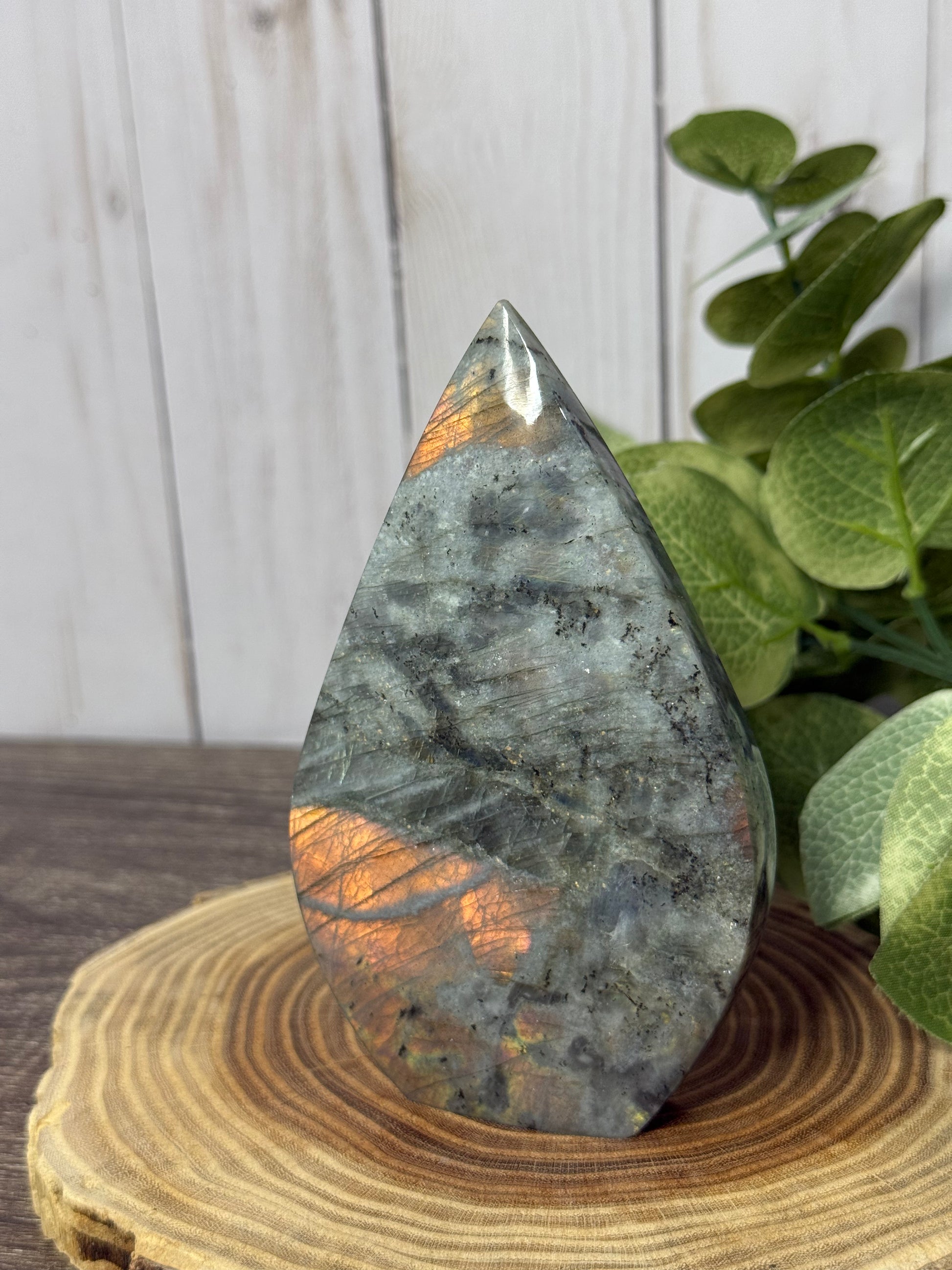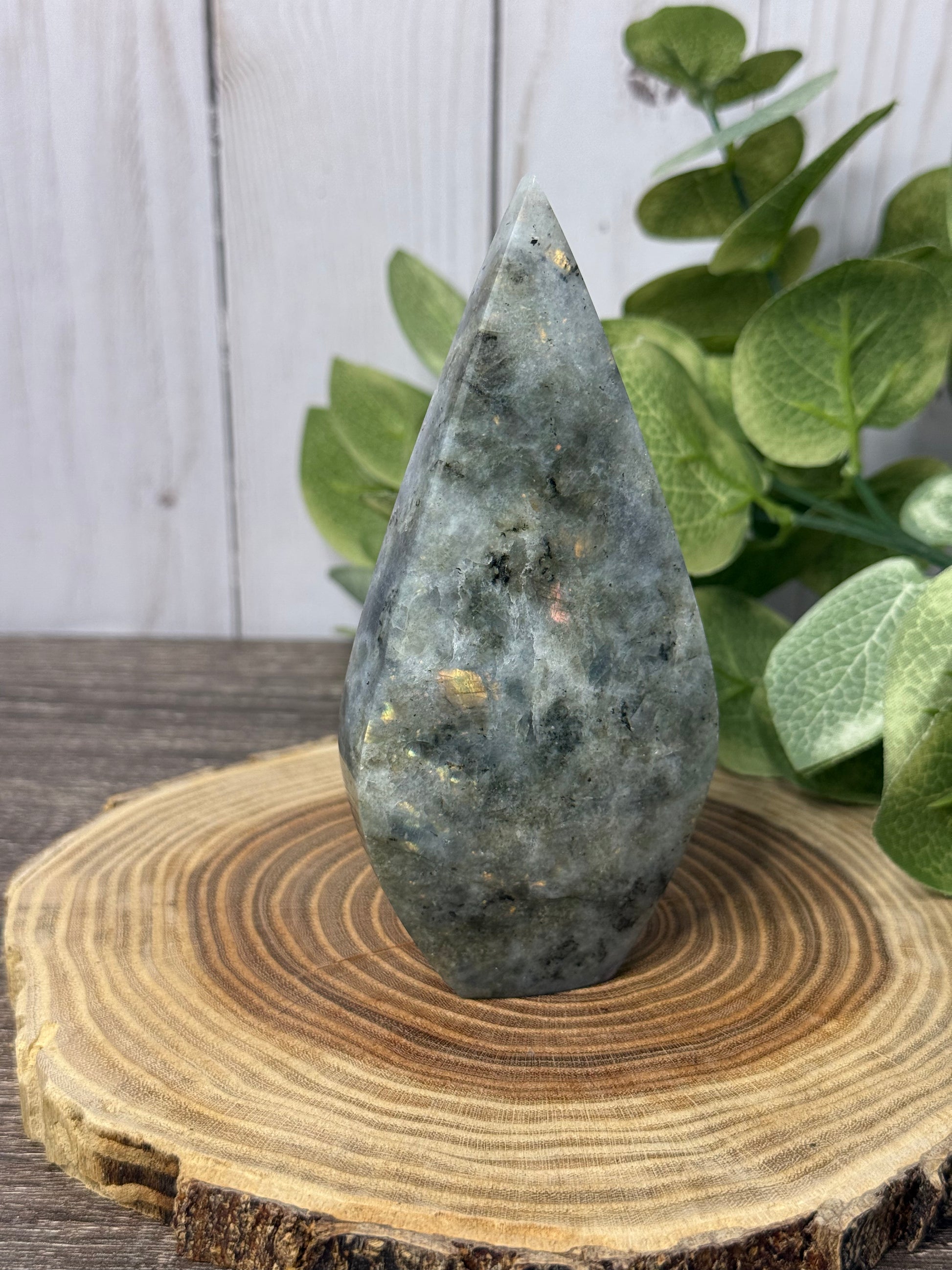 Labradorite is said to hold part of the Northern Lights with its flash. It aids in intuition & psychic abilities, protective, deflects unwanted energies from the aura & removes negativity, can assist with stress, can help open the throat chakra, connects with universal energies & can calm an overactive mind to energize the imagination bringing up new ideas.