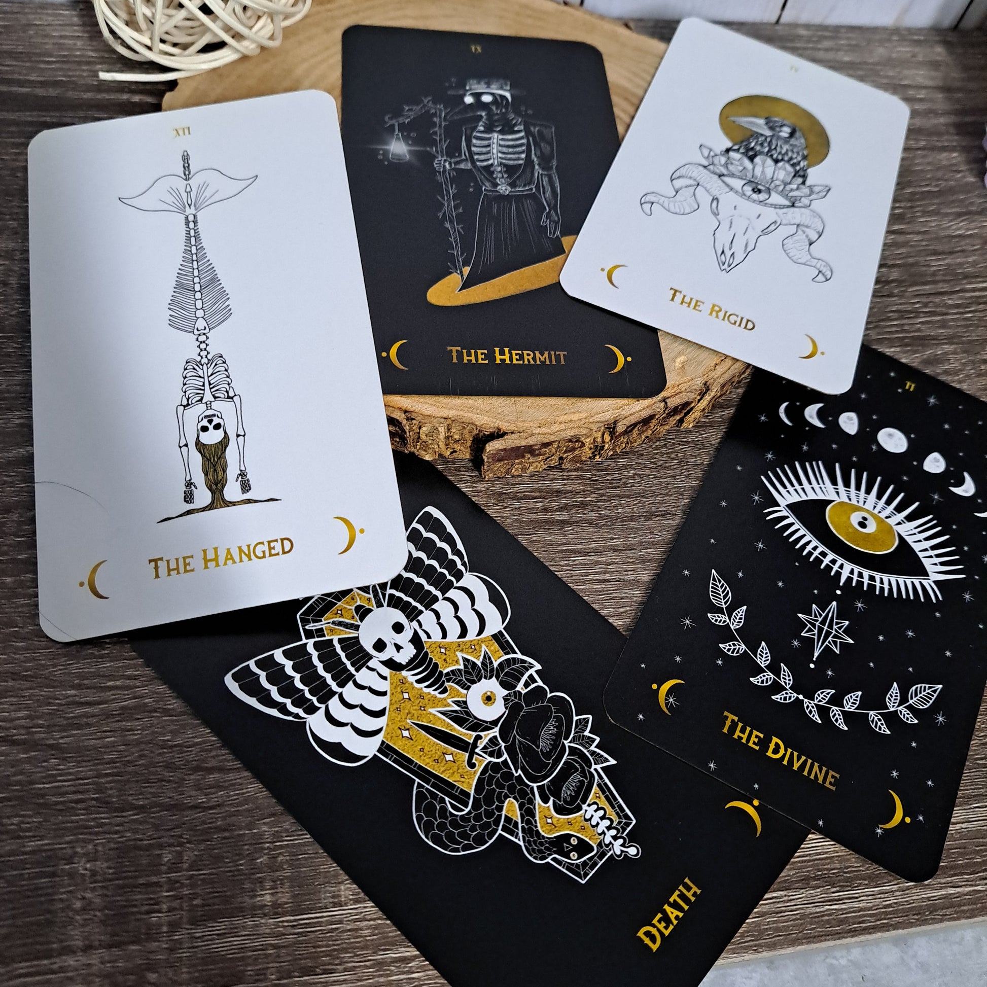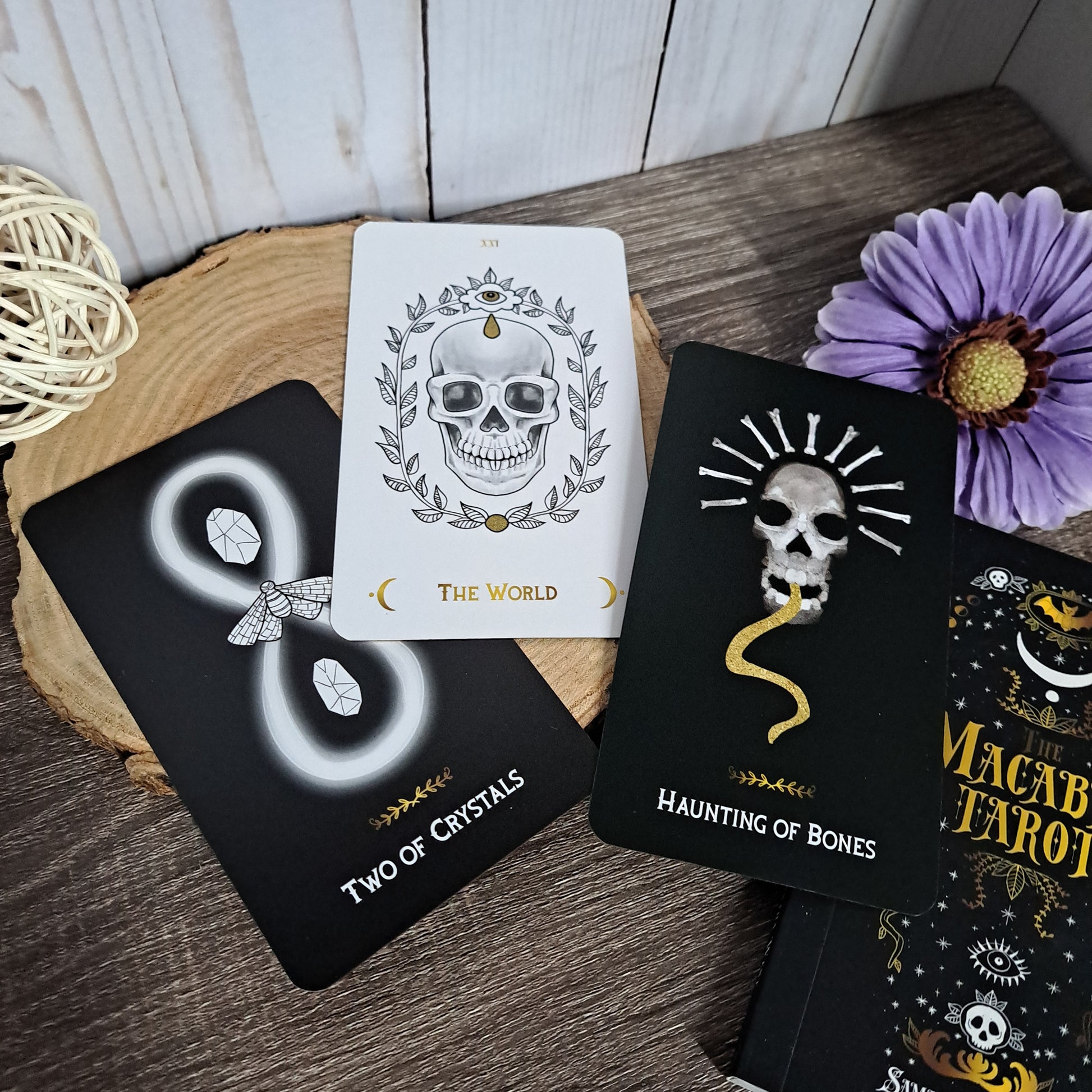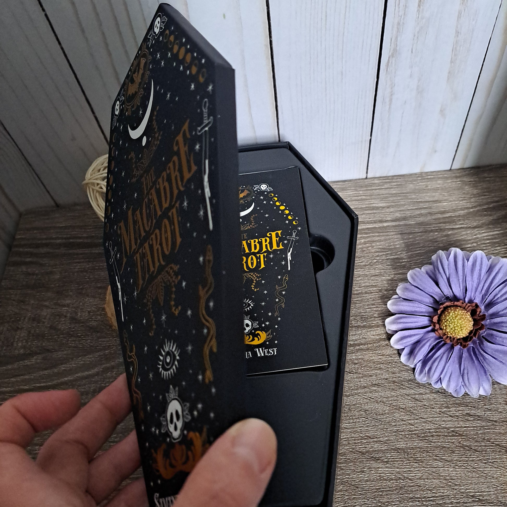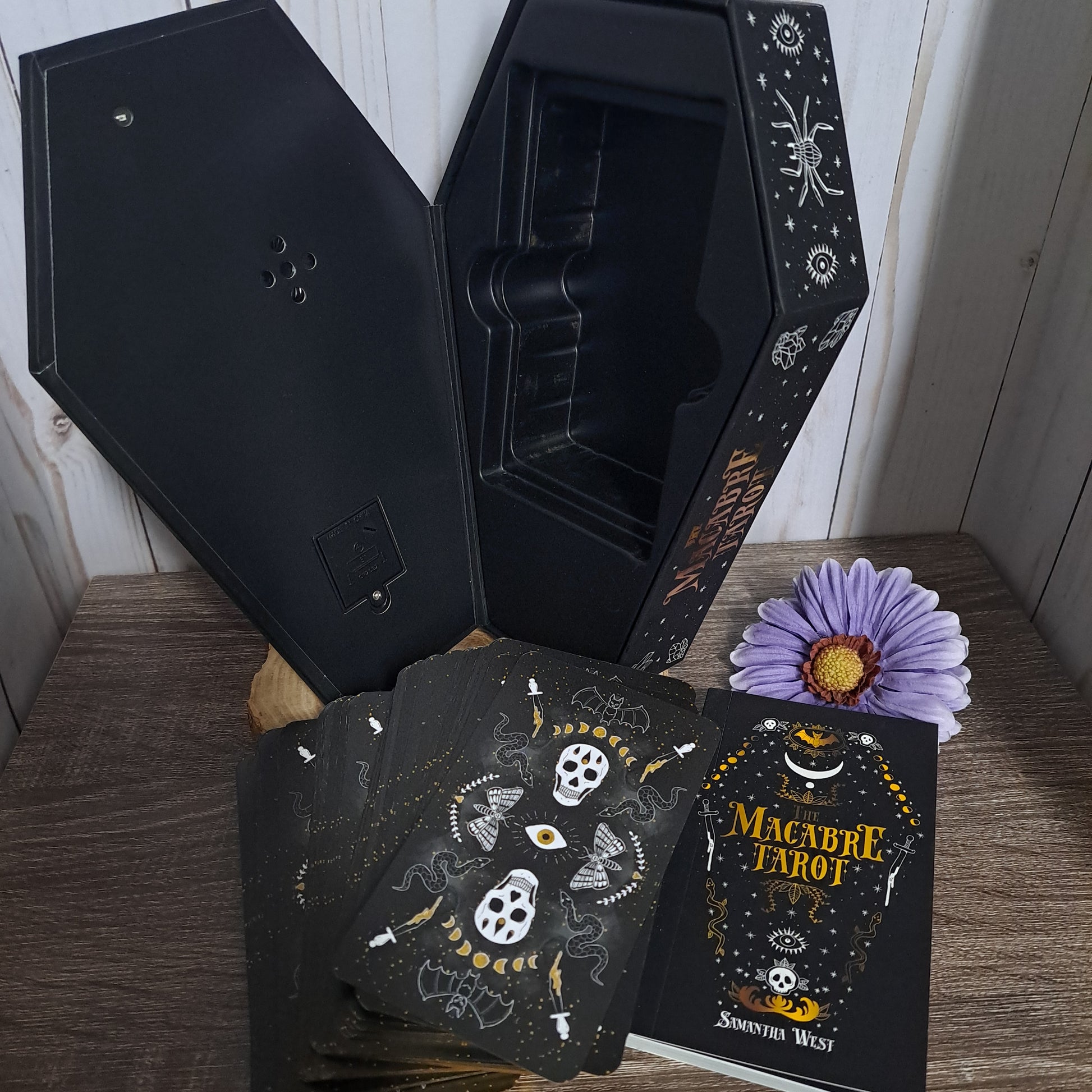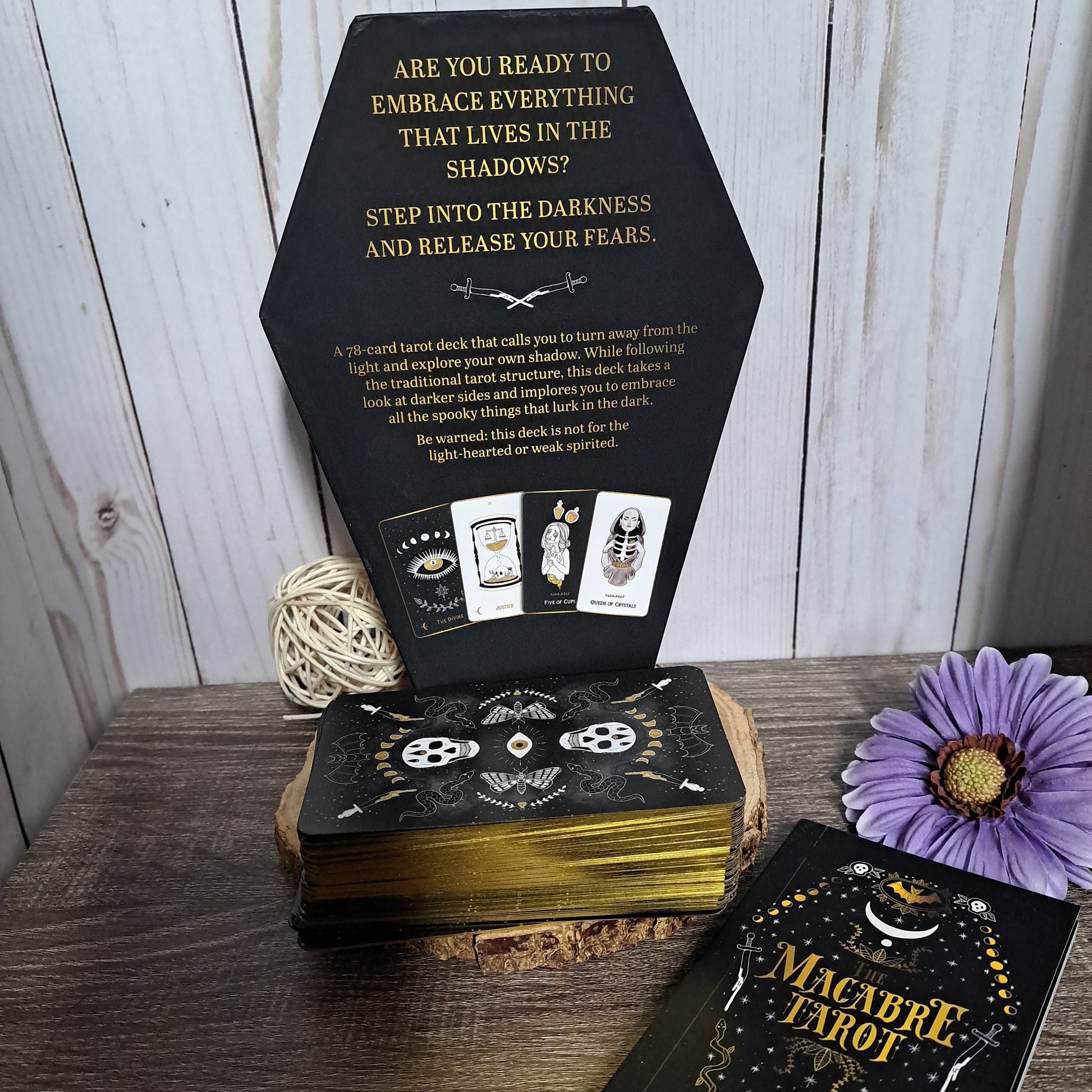 This deck's case comes in the shape of a coffin that makes a creaking sound as it opens. This deck tempts you to turn away from the light and embrace the dark. While following the traditional tarot structure, this deck takes a look at the darker sides of the cards. It implores you to embrace all the spooky things that lurk in the shadows.
