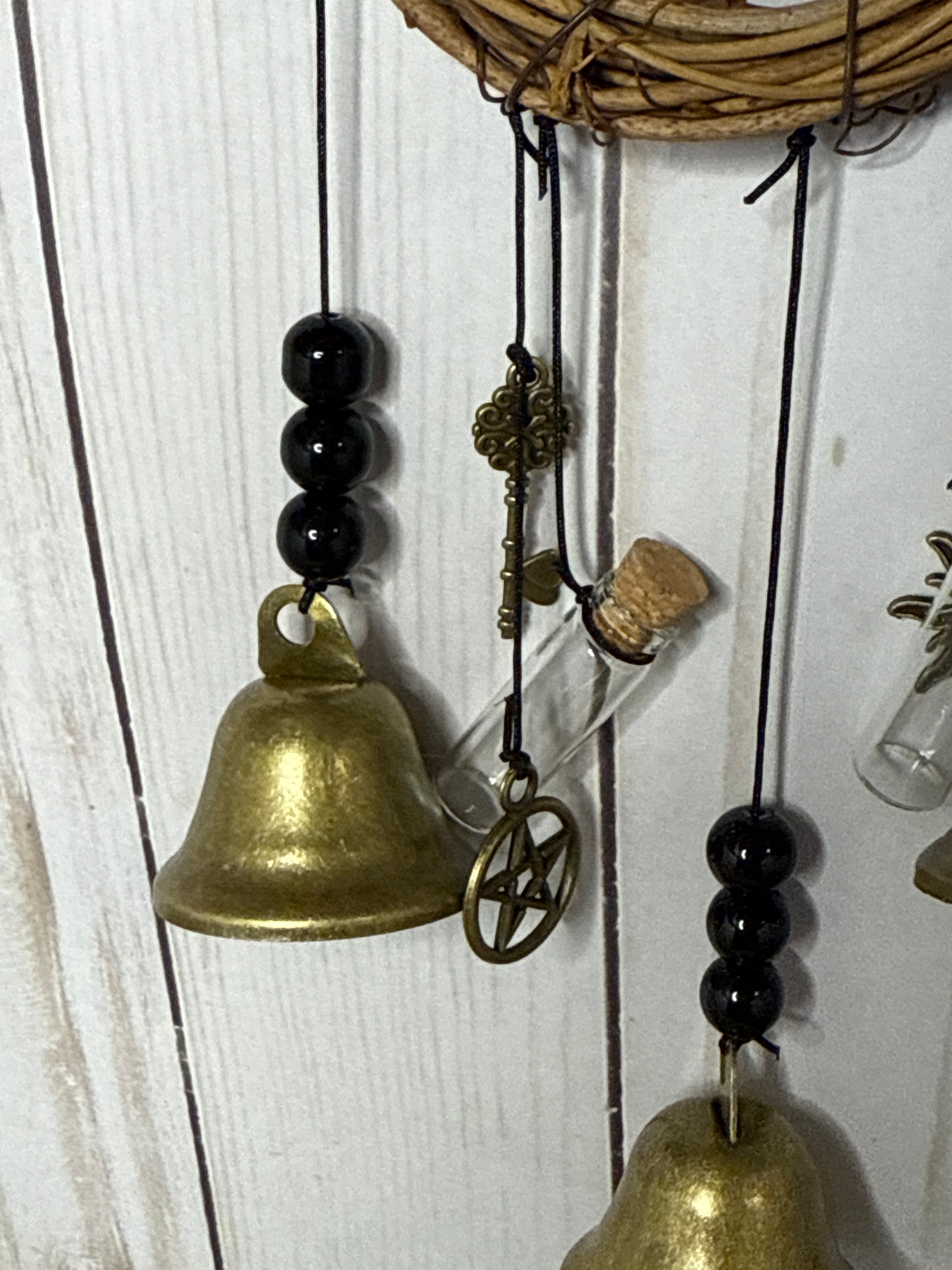 Incorporating elements of the mysterious culture of witches: pentagram, old-fashioned brass bells and vintage keys, carefully polished wooden beads and gems, drive away evil energy and attract positive energy for home.